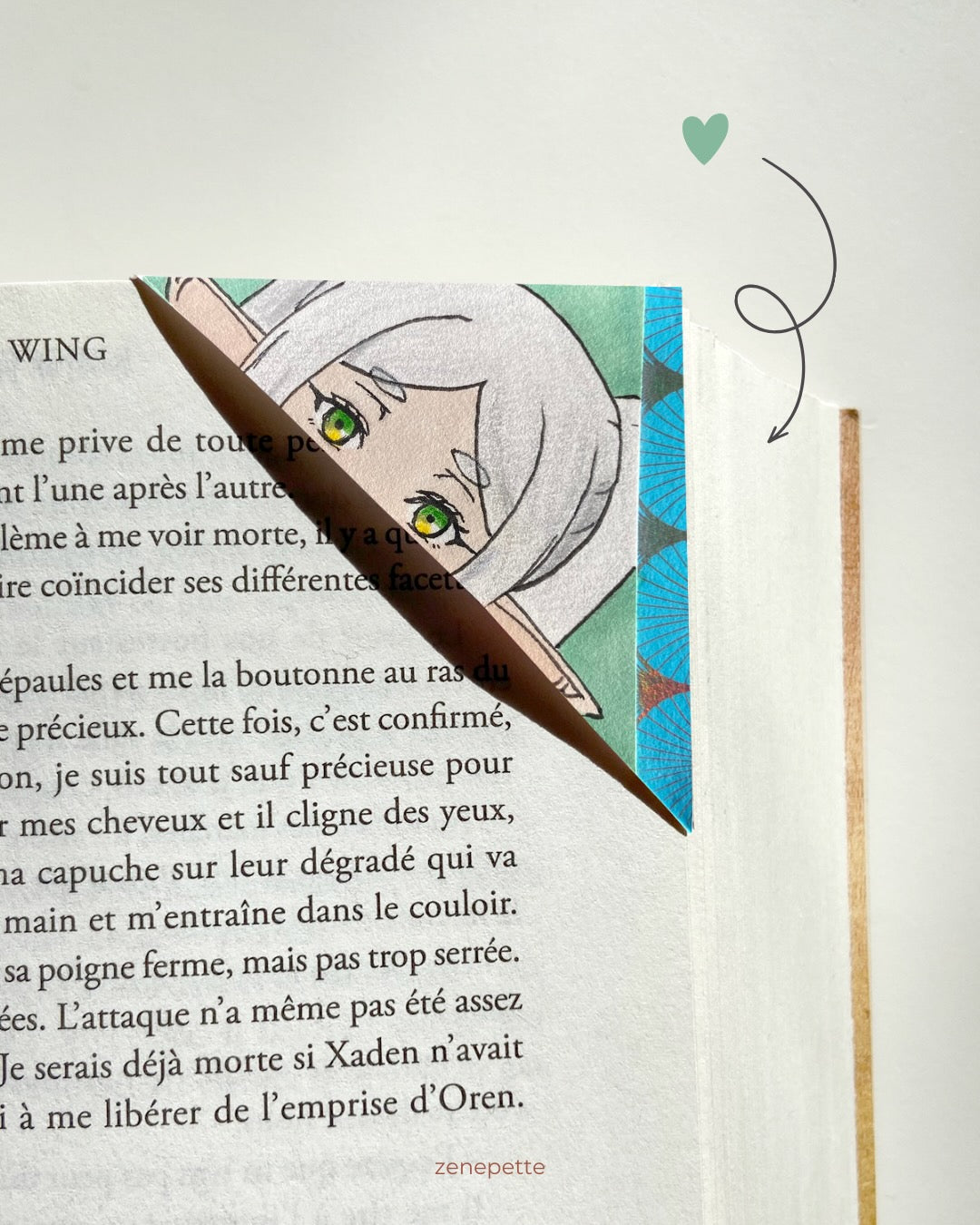 La forme de ce marque-page est élaborée pour jouer entre la partie visible et cachée lorsqu'il est inséré dans la page du livre, ce qui le rend unique par sa forme et sa composition.